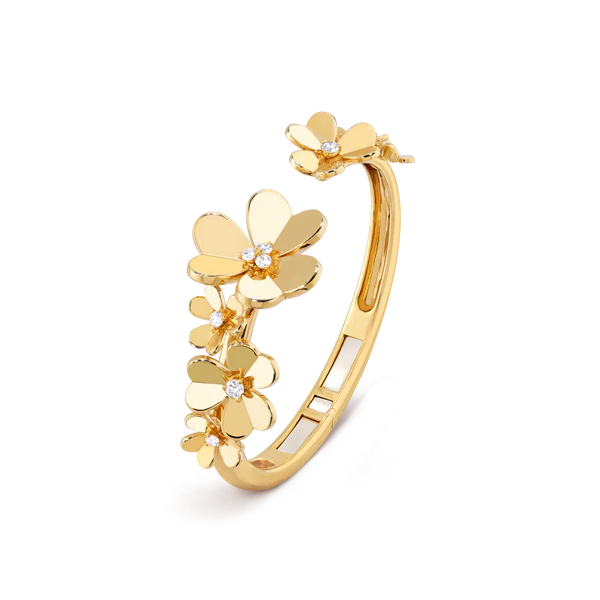 A garden in motion, gracefully encircling the wrist. Seven heart-shaped blossoms flow in luminous succession, each petal mirror-polished to radiate the warm, sun-kissed glow of triple-layered 18K gold. Sculptural yet weightless, bracelet is an ode to nature’s most timeless elegance.